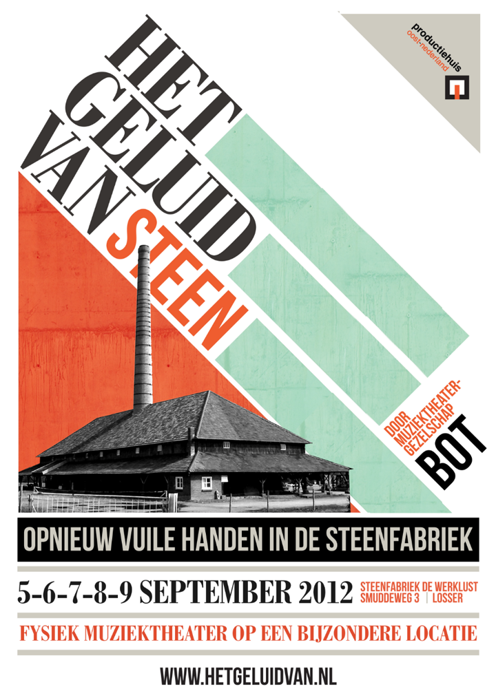 Het Geluid Van (‘The Sound Of’) are site specific performances, inspired by the original identity, sounds and function of abandoned buildings at places throughout the Netherlands. BOT tells the story of industrial heritage buildings by making a musical theatre performance on site.